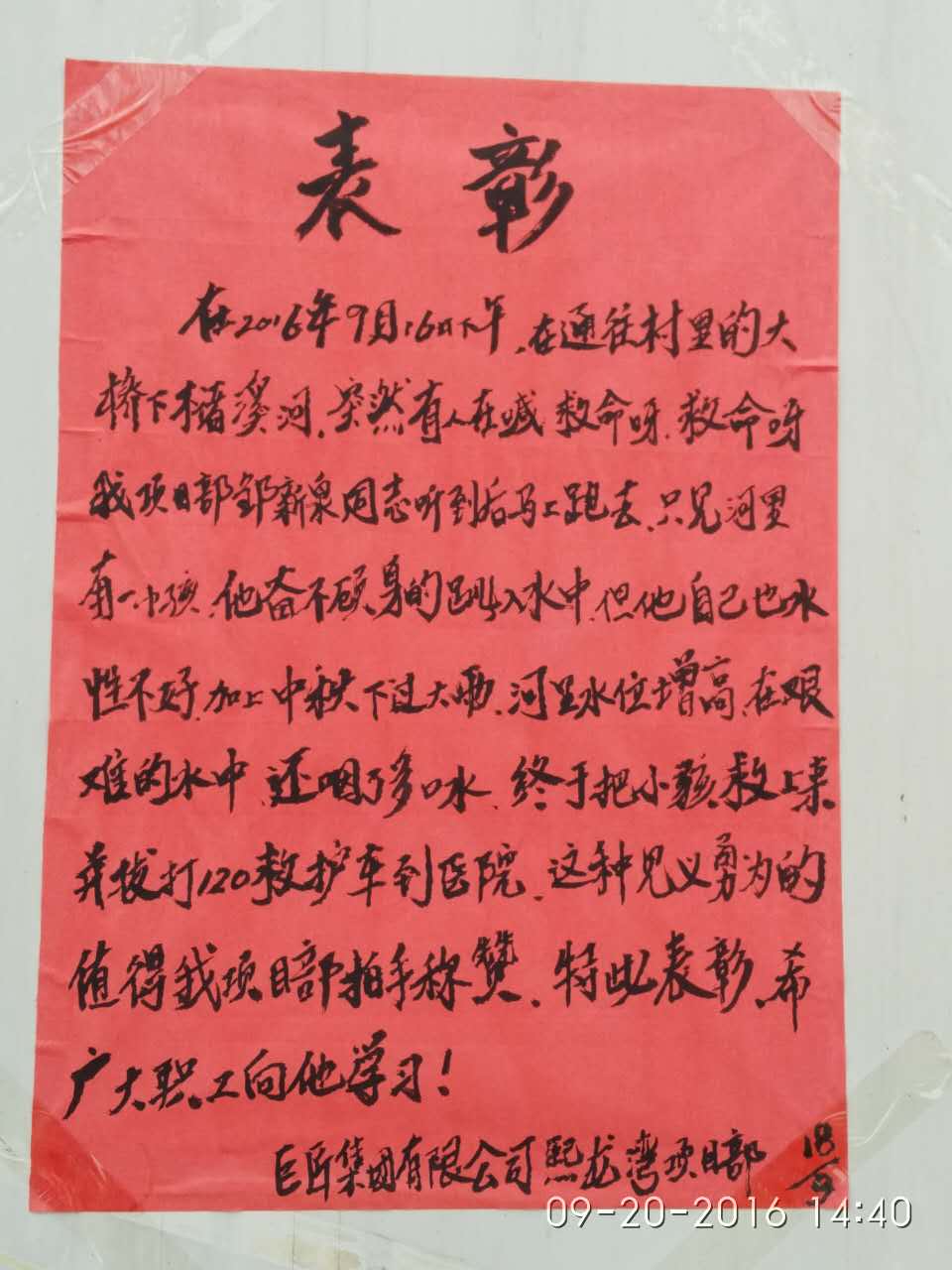 鄒新泉救人的事情很快在項(xiàng)目部傳開(kāi)了,項(xiàng)目部通過(guò)紅榜給他表彰,聽(tīng)說(shuō)還要給他獎(jiǎng)勵(lì),他婉言謝絕,說(shuō)那天換了我們項(xiàng)目部的其他同事也一樣會(huì)這么做。